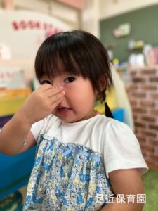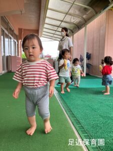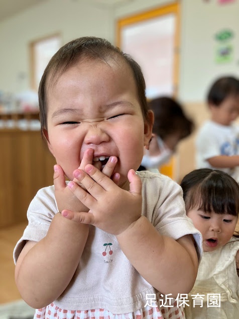 じっと見て、保育者に「おーおー!」と声をあげているお友だち。