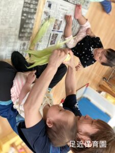 保育者がそっと触ってみせると、ぺりぺりっと皮がむける音がして