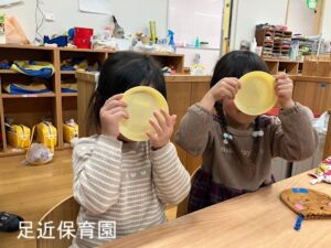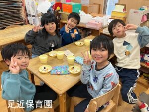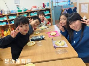 完成した雪だるまを嬉しそうに見せ合いながら、笑顔いっぱいでおやつを味わっていました。
