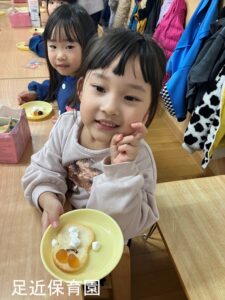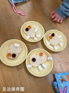 以上児クラスでは、雪だるまの形をしたラスクに、グミやマシュマロをトッピングして、オリジナルの雪だるま作りを楽しみました。
