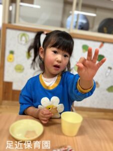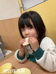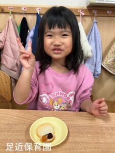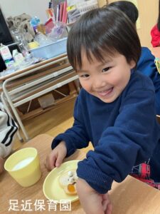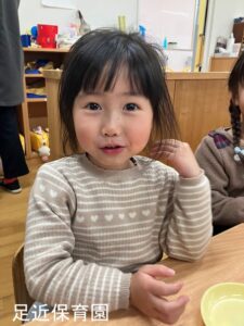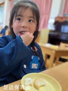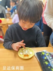 さくら組さんは、マシュマロを味わいながらも、「ここにボタンをつけようかな」「てやかみをつけたいな」と、最後まで雪だるま作りを楽しんでいる姿が見られました。