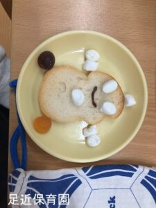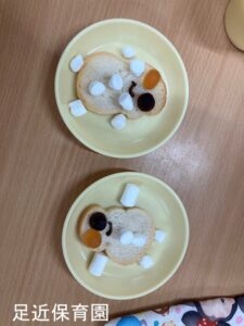 マシュマロをちぎってボタンにしたり、手や足、ほっぺたに見立てたりと、一人ひとりの工夫がたくさん見られました。