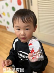 袋についているサンタさんの絵を見て喜び、「くつしたがあるよ」「ぼうしがあるよ」と、会話も弾んでいました。